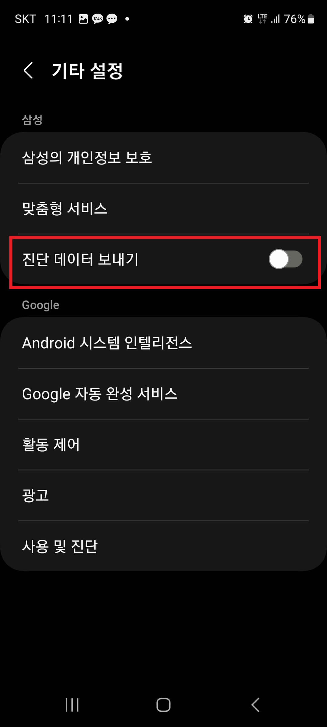 톱니바퀴 모양의 설정 앱을 눌러서 설정 창으로 이동하고 보안 및 개인정보 보호> 개인정보보호> 기타 설정> 진단데이터 보내기(비활성화)