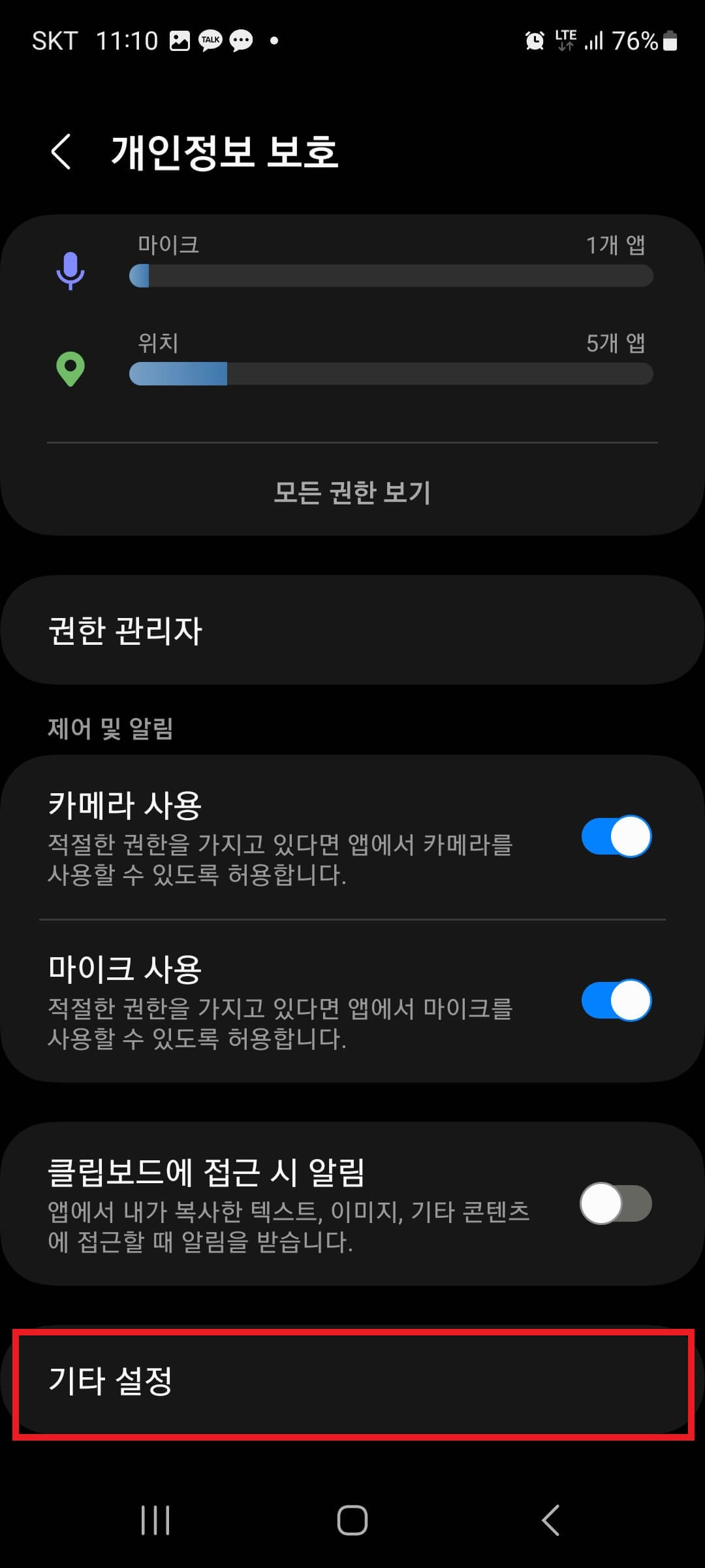 개인정보 보호에서 카메라, 마이크 등 앱 사용권한을 자유롭게 설정을 할 수 있습니다. 아래의 '진단 데이터 보내기' 기능은 제품 및 서비스를 개선하기 위해서 스마트폰에서 진단한 정보를 수집하여 제조업체로 자동으로 보내는 기능입니다. 진단 데이터를 바탕으로 스마트폰 오류 분석을 해결하는 것이 목적인데 이 과정에서 의도치 않게 개인정보도 함께 전송될 수 있는 위험이 있어서 해제하는 것이 안전합니다.