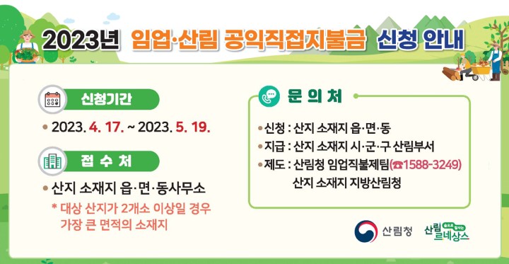 임업 및 산림 공익기능 증진을 위한 직접지불제도 운영에 관한 법률에 따라 2023년도 임업 및 산림 공익직접지불금(임업직불금) 등록신청에 필요한 사항을 다음과 같이 공고합니다.